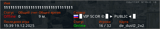 Играет на Counter Strike 1.6 сервере. Страна: РоссияПервый раз замечен 16:51 18.12.2025