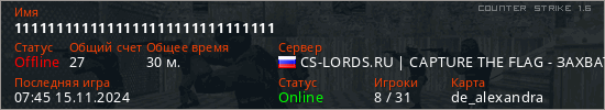 Последний раз был в сети 07:45 15.11.2024 Игрок с таким ником замечен на 31 сервере
