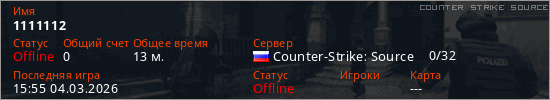 Играет на Counter Strike Source сервере. Страна: РоссияПервый раз замечен 22:02 03.03.2026