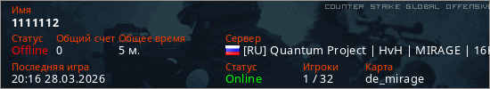 Играет на Counter Strike Global Offensive сервере. Страна: РоссияПервый раз замечен 19:44 28.03.2026