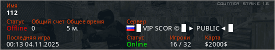 Играет на Counter Strike 1.6 сервере. Страна: РоссияПервый раз замечен 23:58 03.11.2025