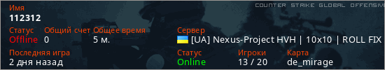 Играет на Counter Strike Global Offensive сервере. Страна: УкраинаПервый раз замечен 10:25 29.01.2026