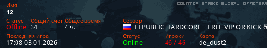 Играет на Counter Strike Global Offensive сервере. Страна: РоссияПервый раз замечен 13:20 29.03.2025