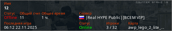 Играет на Counter Strike 1.6 сервере. Страна: РоссияПервый раз замечен 14:26 13.02.2024