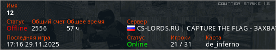 Играет на Counter Strike 1.6 сервере. Страна: РоссияПервый раз замечен 12:57 15.11.2020