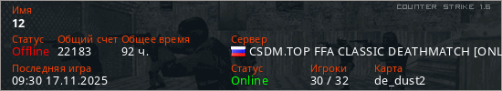 Играет на Counter Strike 1.6 сервере. Страна: РоссияПервый раз замечен 02:35 13.11.2019