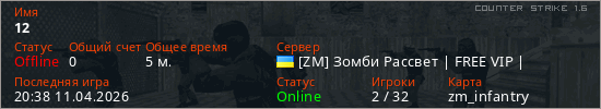Играет на Counter Strike 1.6 сервере. Страна: УкраинаПервый раз замечен 20:28 11.04.2026