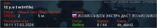 Играет на Counter Strike Global Offensive сервере. Страна: РоссияПервый раз замечен 09:15 17.02.2026