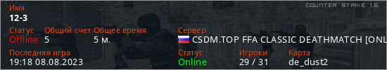 Играет на Counter Strike 1.6 сервере. Страна: РоссияПервый раз замечен 18:55 08.08.2023