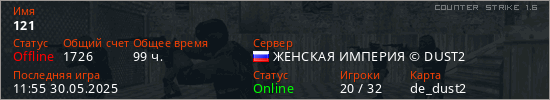 Играет на Counter Strike 1.6 сервере. Страна: РоссияПервый раз замечен 17:54 15.08.2021