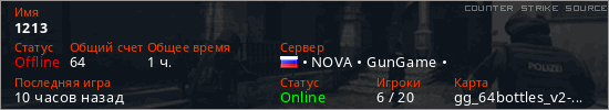 Играет на Counter Strike Source сервере. Страна: РоссияПервый раз замечен 20:32 16.11.2025
