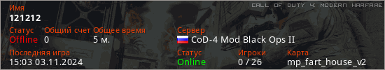 Играет на Call of Duty 4: Modern Warfare сервере. Страна: РоссияПервый раз замечен 15:01 03.11.2024