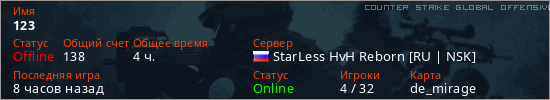 Играет на Counter Strike Global Offensive сервере. Страна: РоссияПервый раз замечен 18:35 21.09.2025