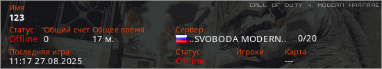 Играет на Call of Duty 4: Modern Warfare сервере. Страна: РоссияПервый раз замечен 05:49 21.02.2025