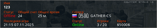 Играет на Counter Strike 1.6 сервере. Страна: РоссияПервый раз замечен 16:23 10.08.2025
