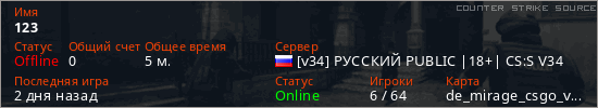 Играет на Counter Strike Source сервере. Страна: РоссияПервый раз замечен 20:14 13.12.2025
