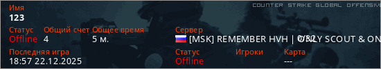 Играет на Counter Strike Global Offensive сервере. Страна: РоссияПервый раз замечен 18:51 22.12.2025