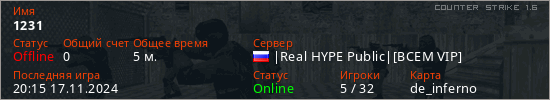 Играет на Counter Strike 1.6 сервере. Страна: РоссияПервый раз замечен 20:09 17.11.2024