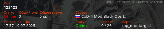 Играет на Call of Duty 4: Modern Warfare сервере. Страна: РоссияПервый раз замечен 17:40 19.07.2025
