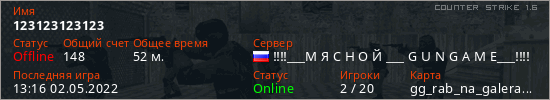Играет на Counter Strike 1.6 сервере. Страна: РоссияПервый раз замечен 13:28 18.04.2022
