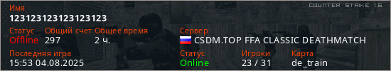 Играет на Counter Strike 1.6 сервере. Страна: РоссияПервый раз замечен 23:46 13.05.2022