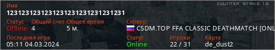Играет на Counter Strike 1.6 сервере. Страна: РоссияПервый раз замечен 05:05 04.03.2024
