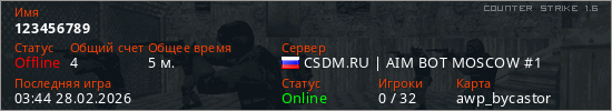 Играет на Counter Strike 1.6 сервере. Страна: РоссияПервый раз замечен 03:40 28.02.2026