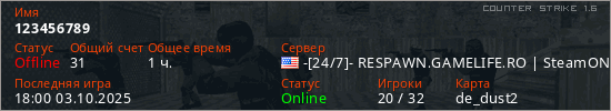 Играет на Counter Strike 1.6 сервере. Страна: СШАПервый раз замечен 05:08 08.02.2025
