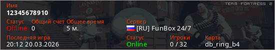 Играет на Team Fortress 2 сервере. Страна: РоссияПервый раз замечен 19:49 20.03.2026