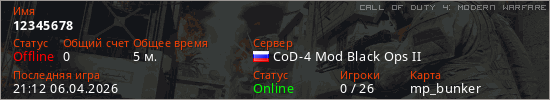 Играет на Call of Duty 4: Modern Warfare сервере. Страна: РоссияПервый раз замечен 21:10 06.04.2026