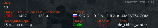 Играет на Counter Strike 1.6 сервере. Страна: РоссияПервый раз замечен 03:11 16.01.2023