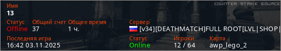 Последний раз был в сети 16:42 03.11.2025 Игрок с таким ником замечен на 58 серверах