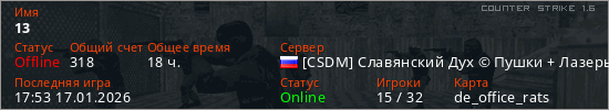 Играет на Counter Strike 1.6 сервере. Страна: РоссияПервый раз замечен 13:08 28.02.2024
