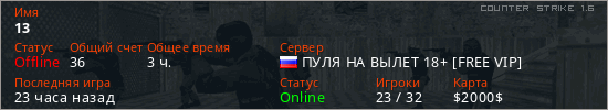 Играет на Counter Strike 1.6 сервере. Страна: РоссияПервый раз замечен 14:03 02.07.2025