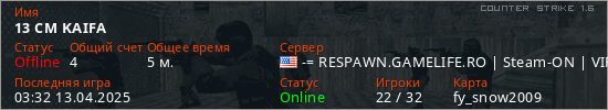 Играет на Counter Strike 1.6 сервере. Страна: СШАПервый раз замечен 03:12 13.04.2025