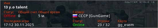 Играет на Counter Strike 1.6 сервере. Страна: РоссияПервый раз замечен 17:10 30.11.2025