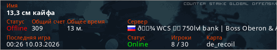 Играет на Counter Strike Global Offensive сервере. Страна: РоссияПервый раз замечен 18:21 08.03.2026