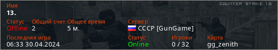 Играет на Counter Strike 1.6 сервере. Страна: РоссияПервый раз замечен 06:29 30.04.2024
