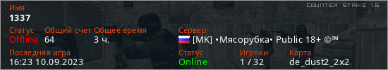 Играет на Counter Strike 1.6 сервере. Страна: РоссияПервый раз замечен 21:33 09.05.2023