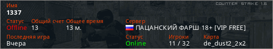 Последний раз был в сети Вчера Игрок с таким ником замечен на 65 серверах