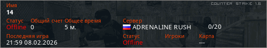 Играет на Counter Strike 1.6 сервере. Страна: РоссияПервый раз замечен 21:46 08.02.2026