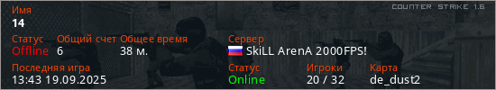 Последний раз был в сети 13:43 19.09.2025 Игрок с таким ником замечен на 40 серверах