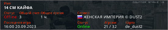 Играет на Counter Strike 1.6 сервере. Страна: РоссияПервый раз замечен 14:13 27.07.2023