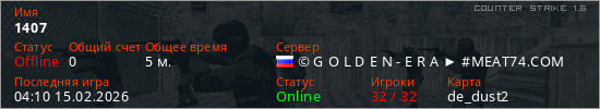 Играет на Counter Strike 1.6 сервере. Страна: РоссияПервый раз замечен 03:47 15.02.2026