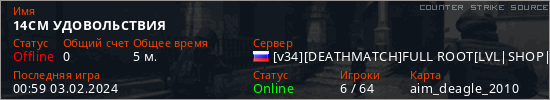 Играет на Counter Strike Source сервере. Страна: РоссияПервый раз замечен 00:42 03.02.2024