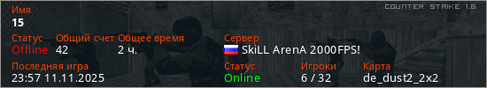 Играет на Counter Strike 1.6 сервере. Страна: РоссияПервый раз замечен 11:02 09.08.2022
