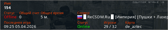 Играет на Counter Strike 1.6 сервере. Страна: РоссияПервый раз замечен 09:23 05.04.2026