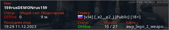 Играет на Counter Strike Source сервере. Страна: РоссияПервый раз замечен 19:50 08.12.2023