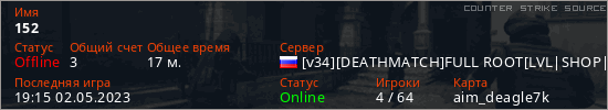 Играет на Counter Strike Source сервере. Страна: РоссияПервый раз замечен 17:08 26.04.2023