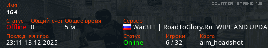 Играет на Counter Strike 1.6 сервере. Страна: РоссияПервый раз замечен 22:43 13.12.2025
